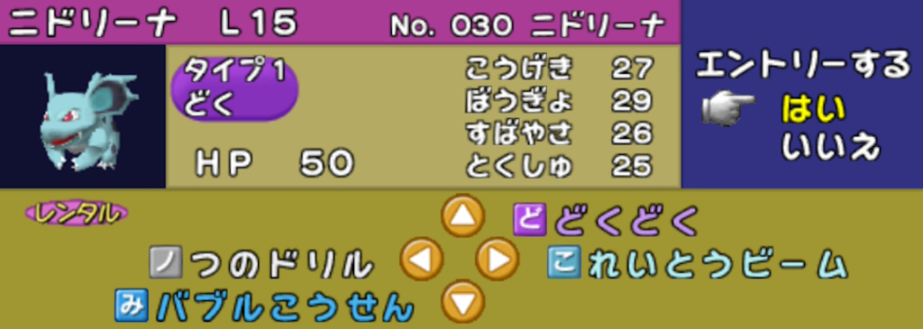 ニドリーナは基本相手に上を取られているので、被弾が避けられない点と、バブル光線 で素早さダウンを引く所から開始する点が辛いです。レベル差があると1段階の素早さダウンでは上を取れないこともあります。のしかかり で麻痺をまけるニドリーノとの選択だが、初代のノーマルタイプは のしかかり で麻痺しないのが悩ましいです。