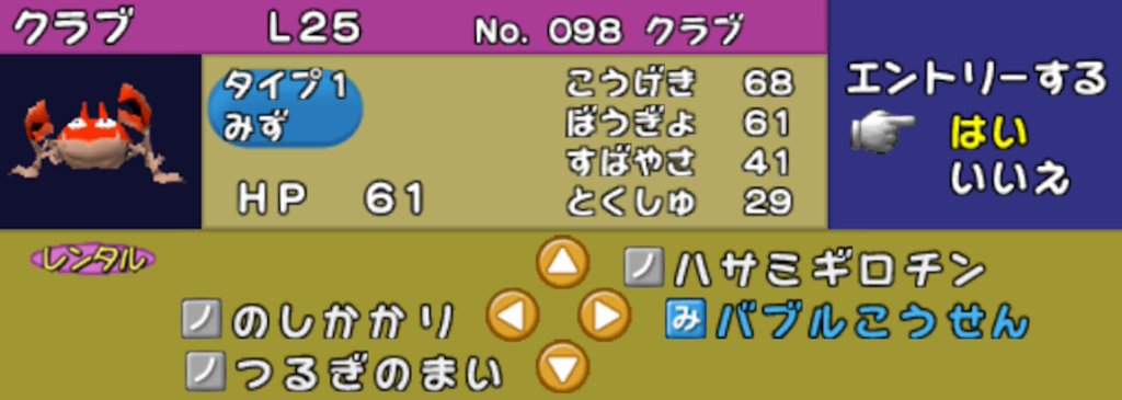 クラブ:のしかかり& バブル光線+ハサミギロチン を所持している。素早さが低いのが辛いです。