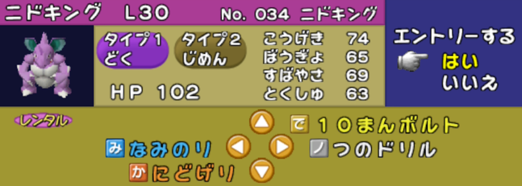 ニドリーナ:バブル光線 (30%素早さダウン) + つのドリル を持っています。のしかかり (30%で麻痺) + つのドリル のニドリーノでも可です。ニドリーナの方が耐久がわずかに高く、ニドリーノの方が素早さがわずかに高いです。
