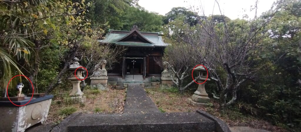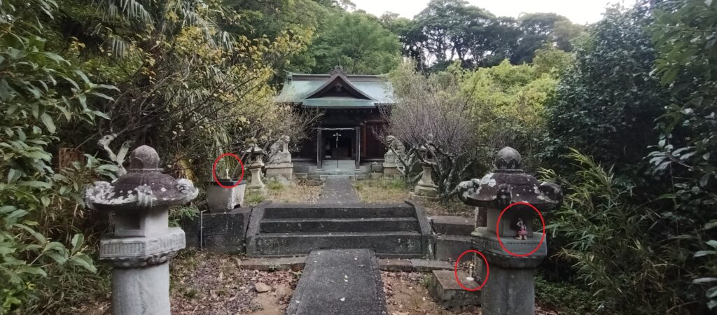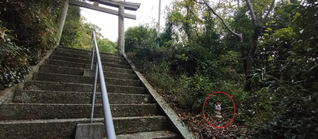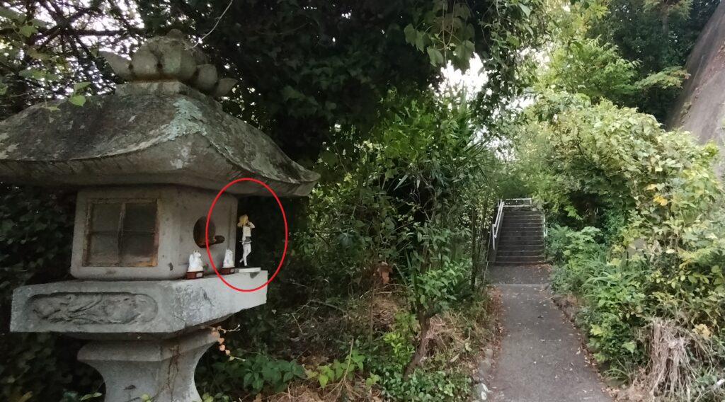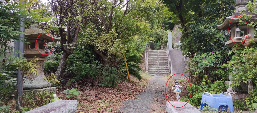 三津天満宮は海照寺の敷地内にあります。三津天満宮への道には、なぜかラブライブ!関連のフィギュアが置いてあります。初見だとビビります。