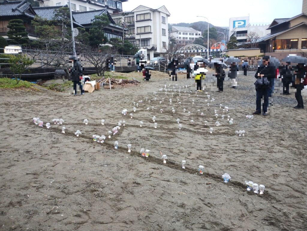 浜辺の画像。画像内で桜の花びらで文字を書いていることから、河津桜が植えられている三津浜での撮影と予想するが、特定が難しいので★★★。