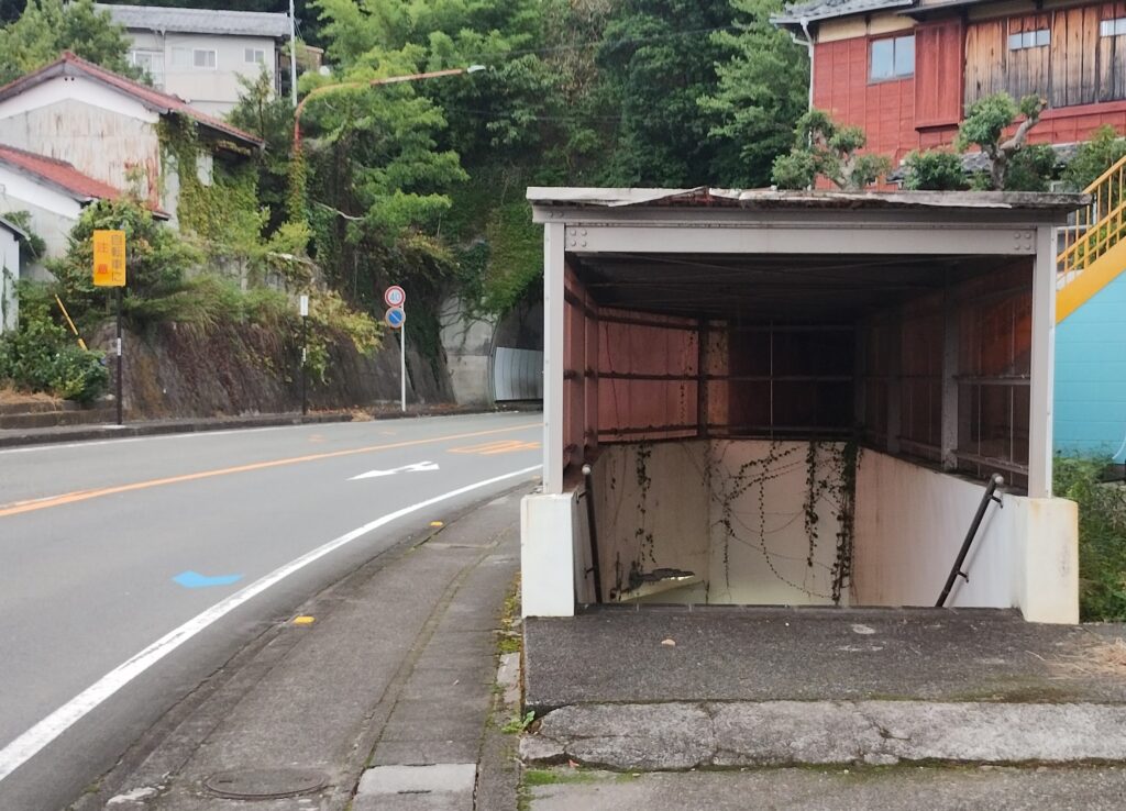 長井崎のバス停そばの電話ボックス。電話ボックスは撤去されているようです。