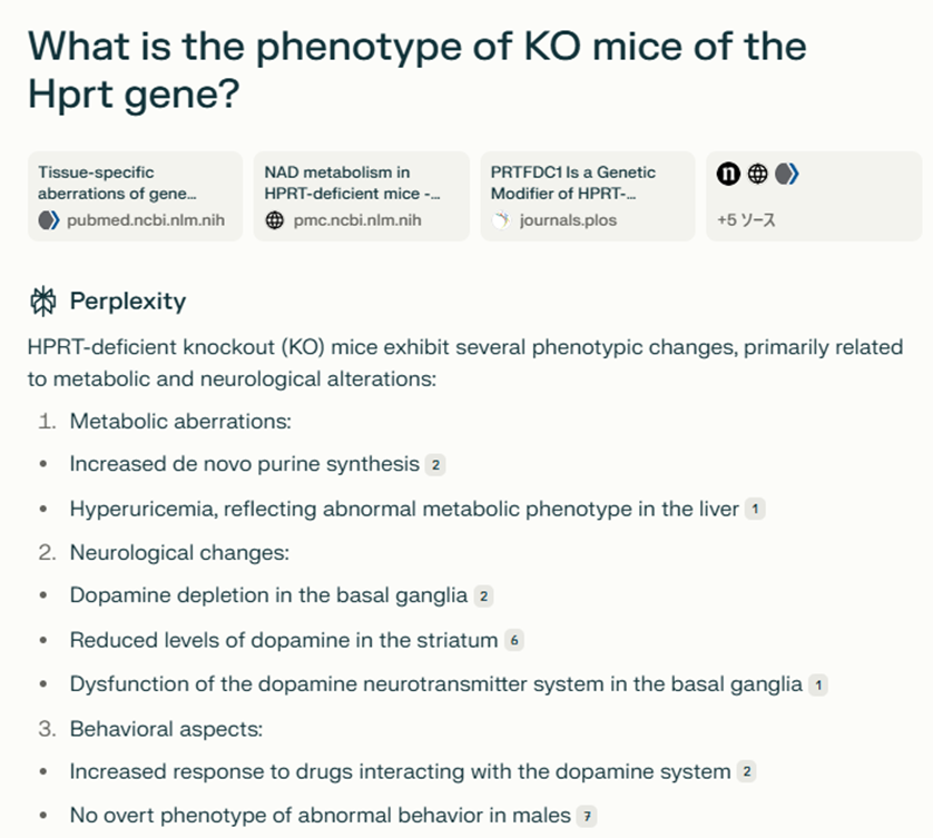 たとえば、「○○遺伝子のノックアウトマウスの表現型を教えてください」と入力するだけで、関連情報を得ることができます。ただし、ソースを確認して情報の真偽に注意を払いましょう。
