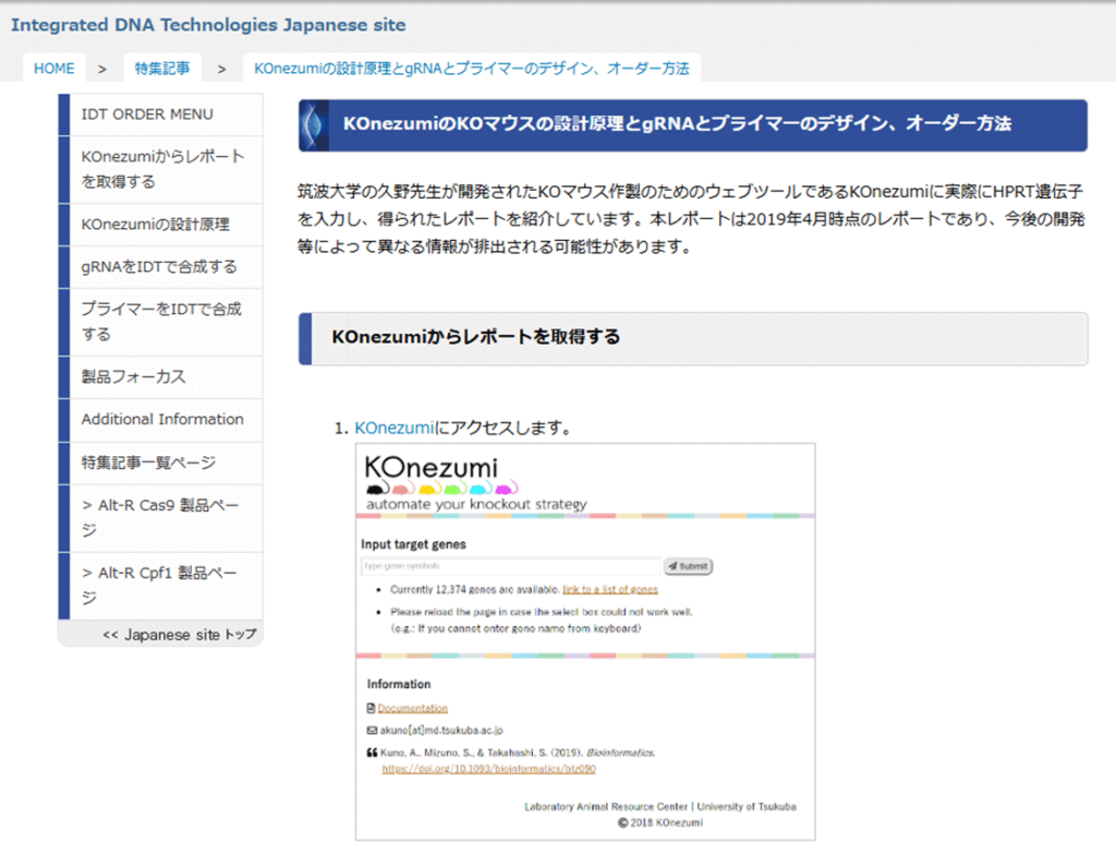 IDTのホームページには、Konezumiの使い方や、IDTを通じてガイドRNAやプライマーを注文する方法が詳しく解説されています。