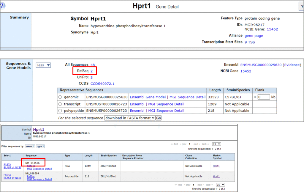 MGIでHprt1を検索し、RefSeqからシークエンス番号を確認します。