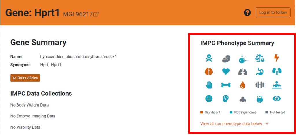 IMPCのサイトでは、遺伝子KOの詳細な影響や表現型情報を入手できます。現状、すべてのマウス遺伝子の情報が網羅されているわけではありませんが、目的の遺伝子の情報が登録されていれば、有用な参考資料となります。