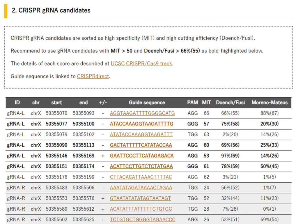 もちろん、ガイドRNAの具体的な配列も詳細に提示してくれます👇