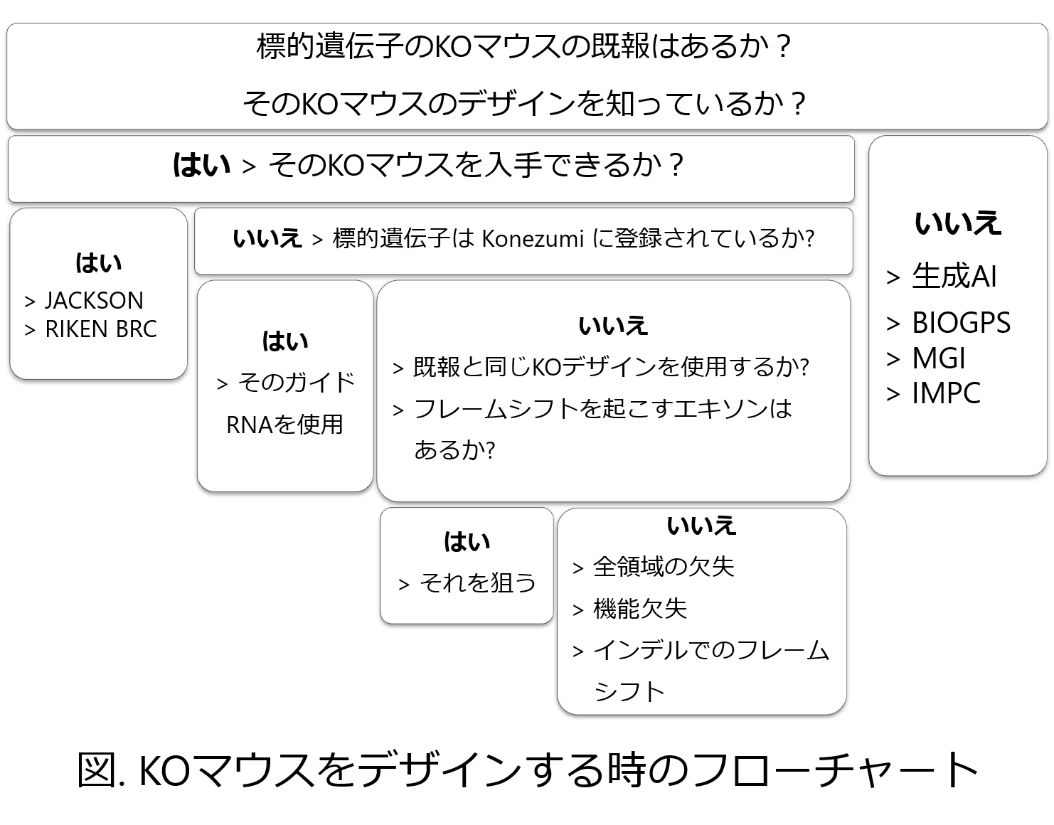 まずは「標的遺伝子のKOマウスの既報はあるか(既報を知っているか)? そのKOマウスのデザイン(設計情報)を知っているか?」という問いからスタートしましょう。