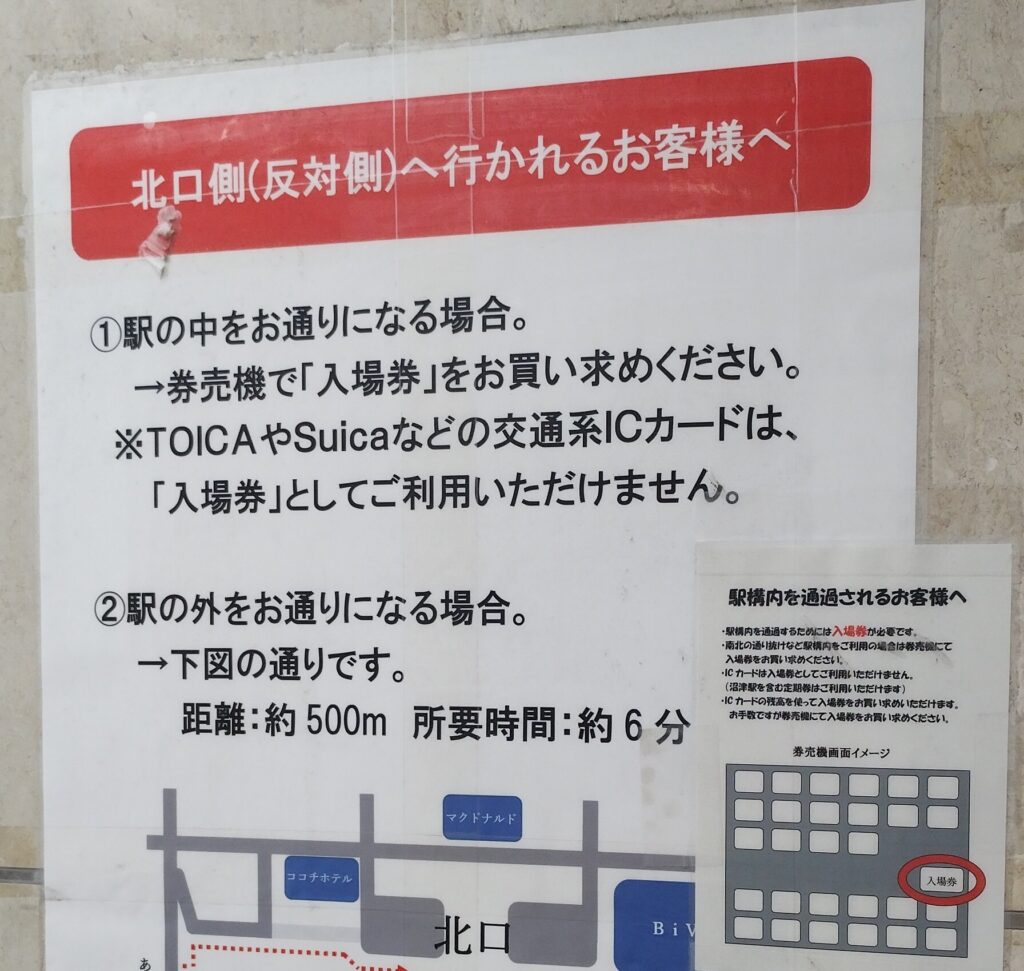 最もスムーズに南北を行き来できるのが、入場券(150円)を使って駅構内を通り抜ける方法です。