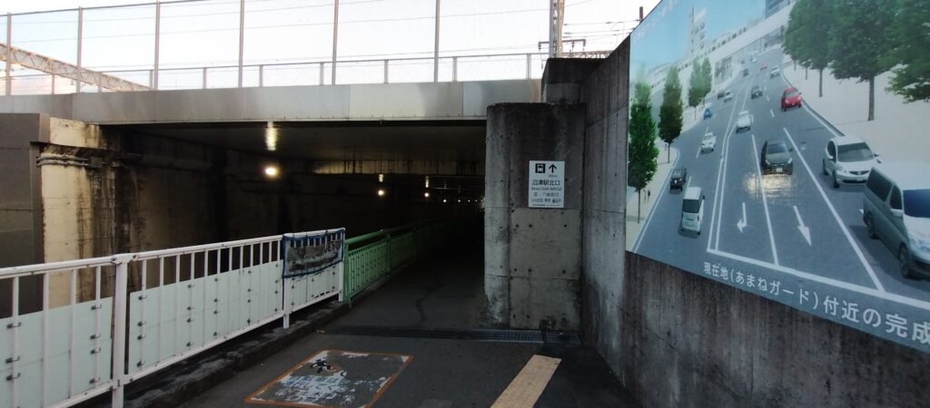 駅の外を通る無料ルートとして代表的なのが、あまねガード下を抜けるルートです。