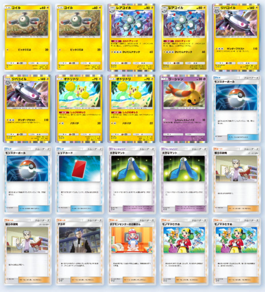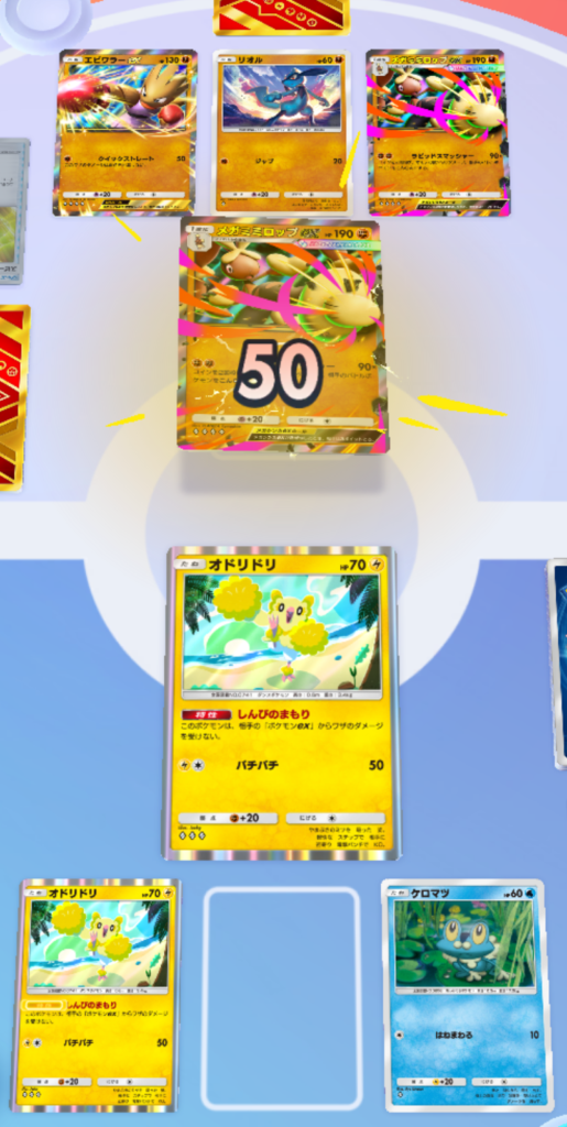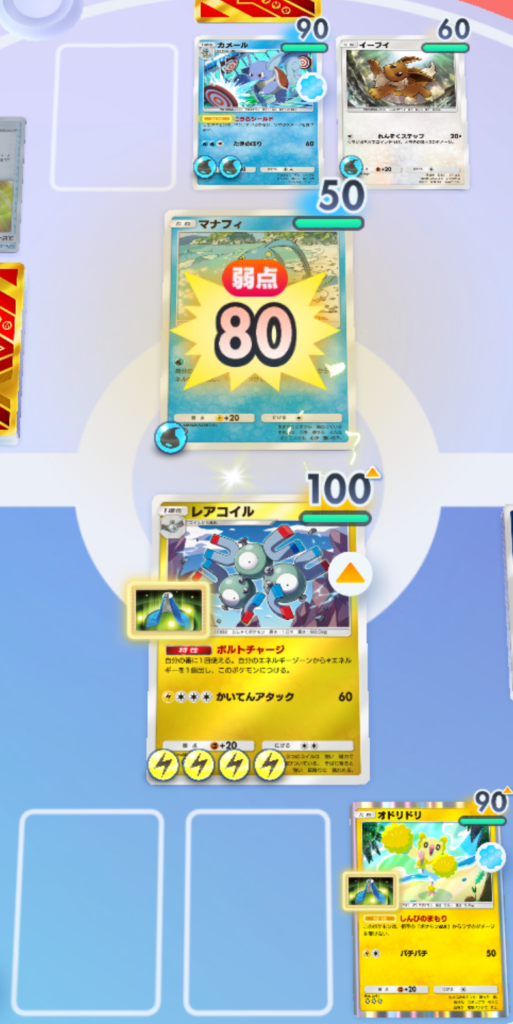 - バトル場ではオドリドリが守りの要として立ち、ベンチではレアコイルが特性を活かして雷エネルギーを蓄積。