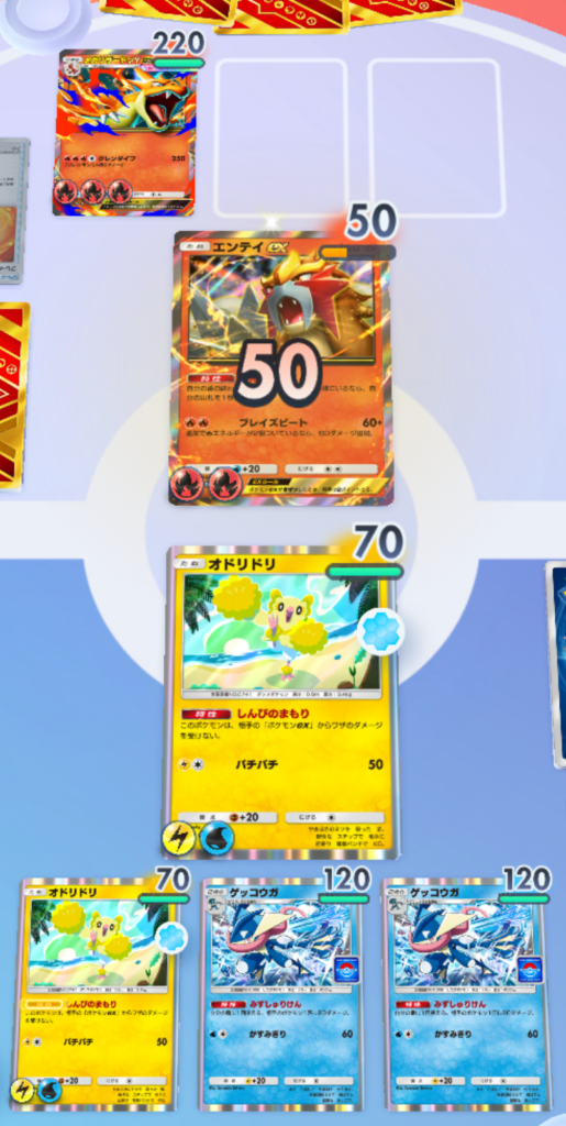 - バトル場ではオドリドリが耐え、ベンチのゲッコウガがじわじわと相手を削ります。