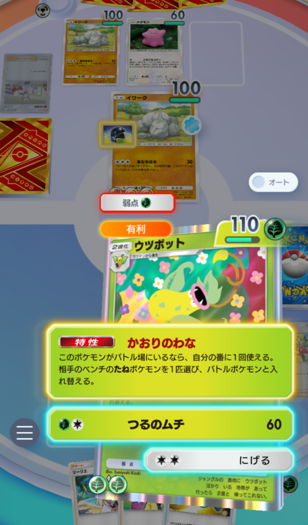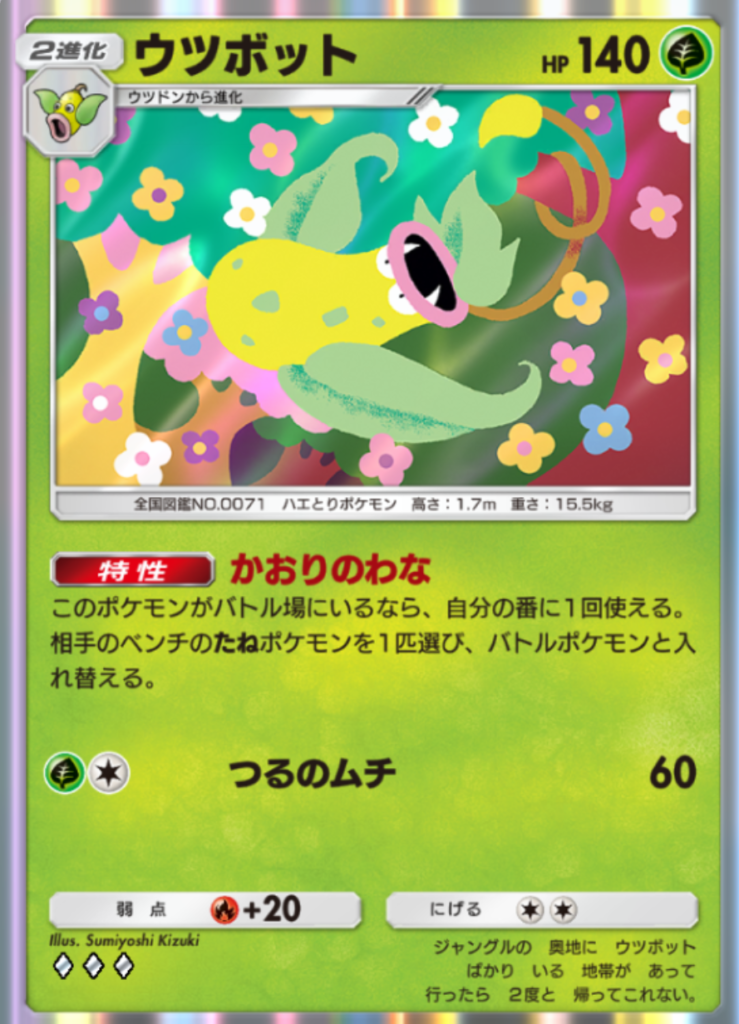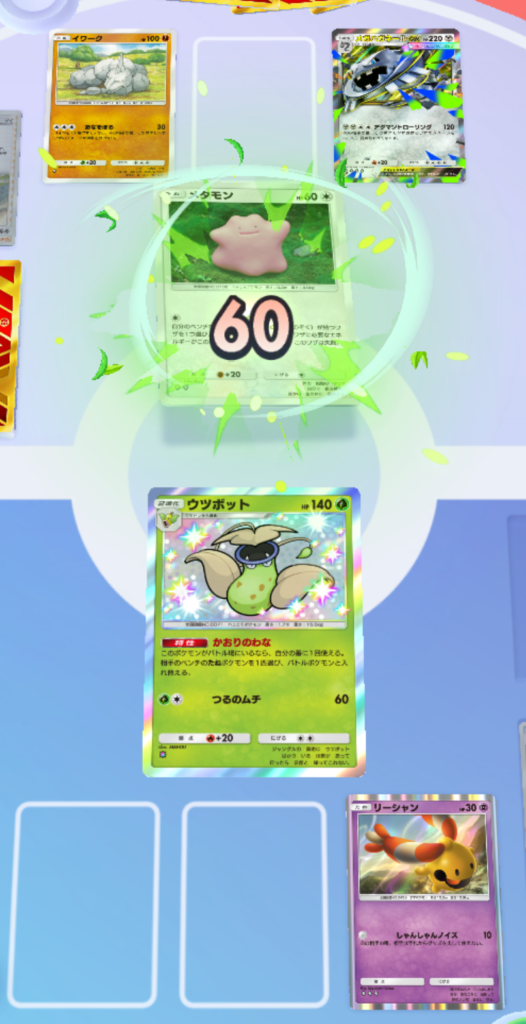 - ふしぎなアメによる2進化ポケモン展開を狙うデッキには、リーシャンやセレビィのワザで妨害可能。ウツボットが対象にできるのはたねポケモン限定のため、これらの妨害と自然に噛み合います。