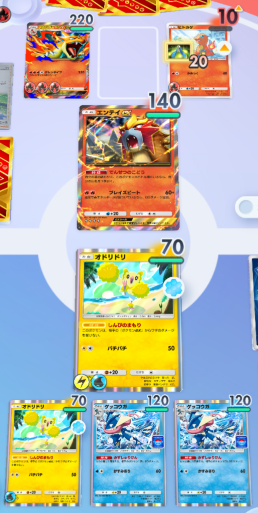 対メガリザードンY ex & エンテイex: オドリドリで相手のエンテイexやメガリザードンY exを完全に封じ込め、ゲッコウガの特性で削りながらオドリドリでエンテイexを倒して勝利👇