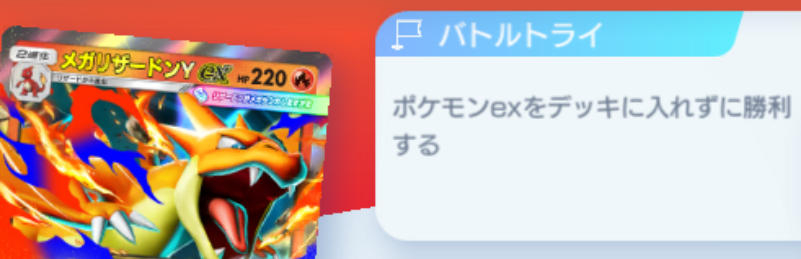 ポケポケ「紅蓮ブレイズ」のエキスパートバトル(ひとりでバトル)では、「ポケモンexをデッキに入れずに勝利する」という難しい条件のバトルトライがあります。