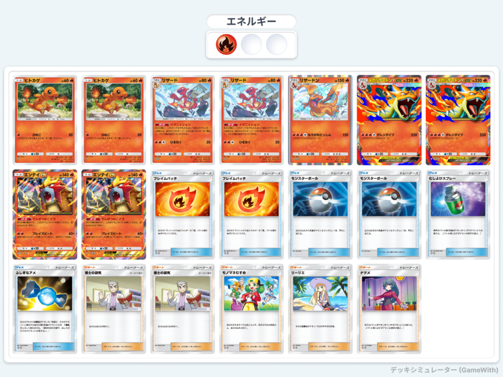 - 炎エネルギー4個で250ダメージを安定して狙えるメガリザードンY exを主軸に据えたデッキです。