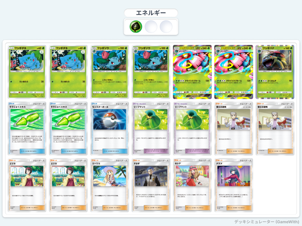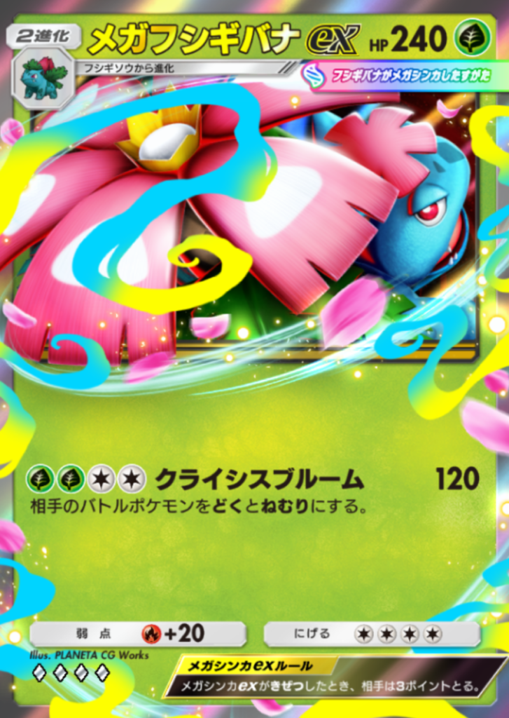 - 120ダメージに加え、どく・ねむりを同時に狙えるメガフシギバナexを軸としたデッキです。