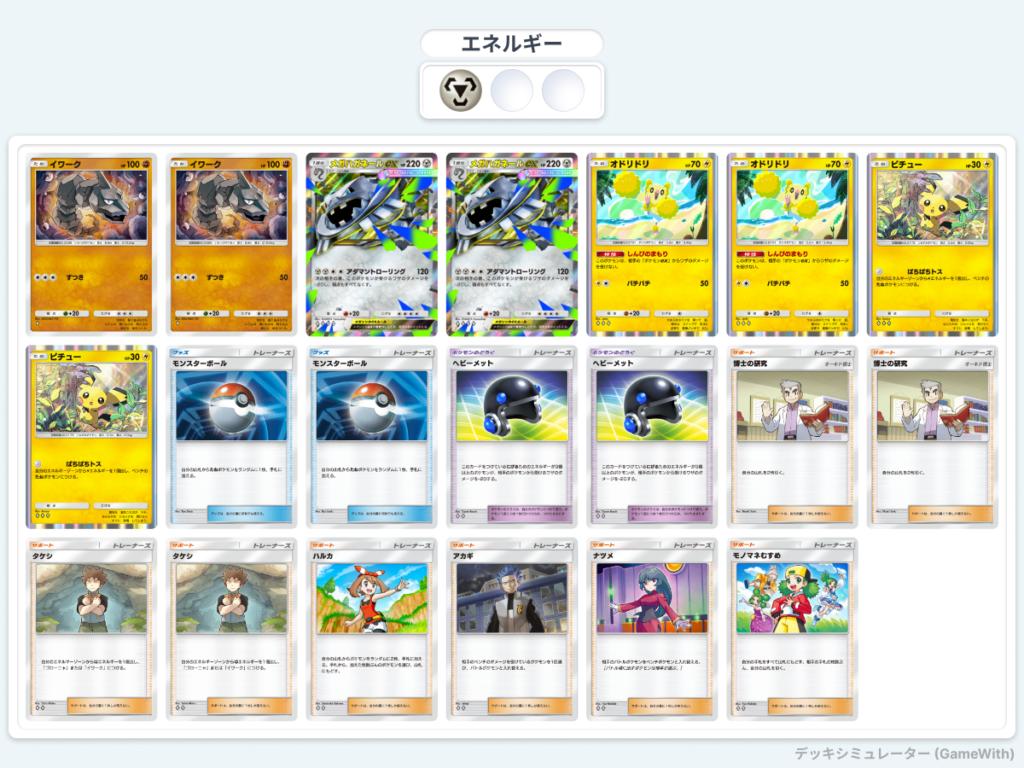 - 無色エネルギーでワザを使えるイワークを採用しており、ピチューやタケシを活用することで、序盤からエネルギーを付けて攻撃に移れます。