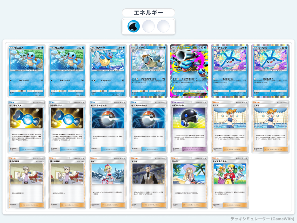 - カスミやカイといった水ポケモン専用のサポートカードを採用し、展開力と安定性を両立しています。