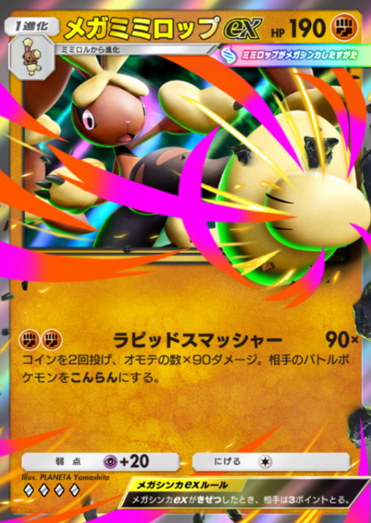 - エネルギー2個で最大180ダメージに加え、こんらんを付与できるメガミミロップexを中心とした速攻型デッキです。立ち上がりが早く、序盤から相手にプレッシャーをかけられます。