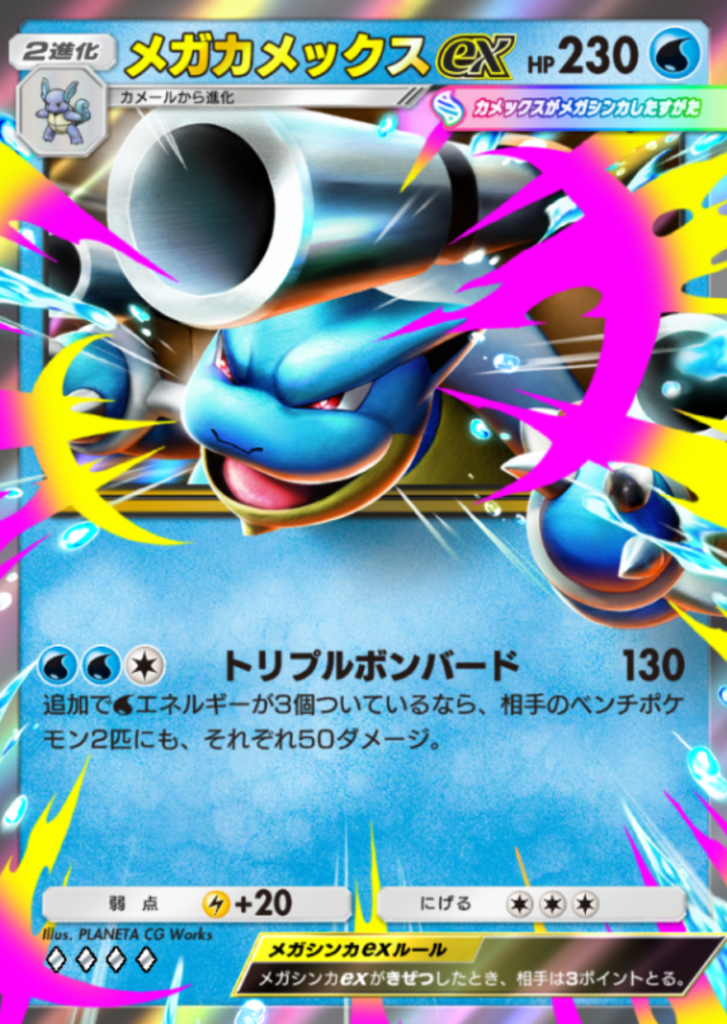- 水エネルギー3個で130ダメージ、6個なら相手ベンチも含めて合計230ダメージを与えられるメガカメックスexを採用したデッキです。