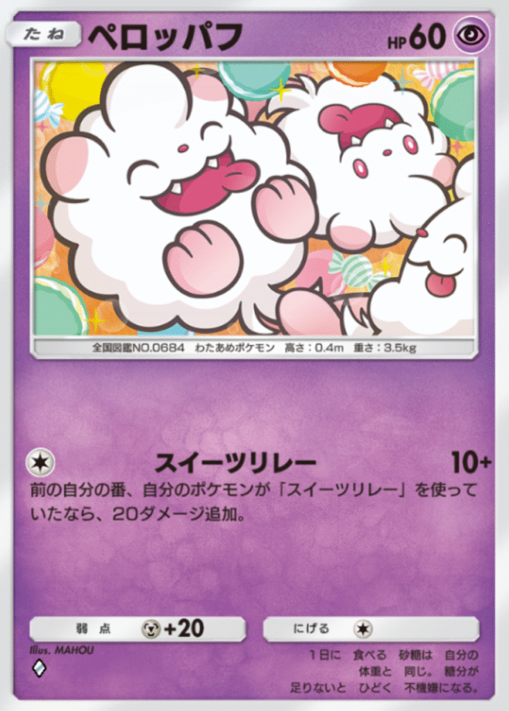 - このデッキでは、バトル序盤にペロッパフやペロリームで「スイーツリレー」を繰り返し使い、対戦中の回数を稼ぎます。
