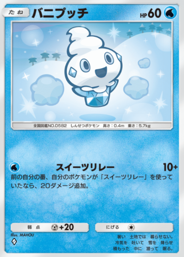 「スイーツリレー」を使うポケモンの中には水エネルギーを必要とするバニプッチやバニリッチや草エネルギーを必要とするタルップルもいますが、マホミルやマホイップはどんなエネルギーを使うデッキでも使えるのが魅力です。