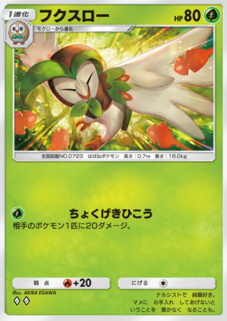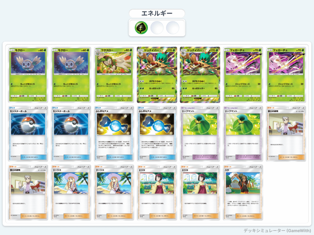 - ベンチ攻撃を重視した構成で、モクロー(双点の守護者ルナアーラ)、フクスロー(異次元クライシス)、フェローチェなどを採用し、ジュナイパーexの「きずをうちぬく」が通りやすくなるように工夫されています。