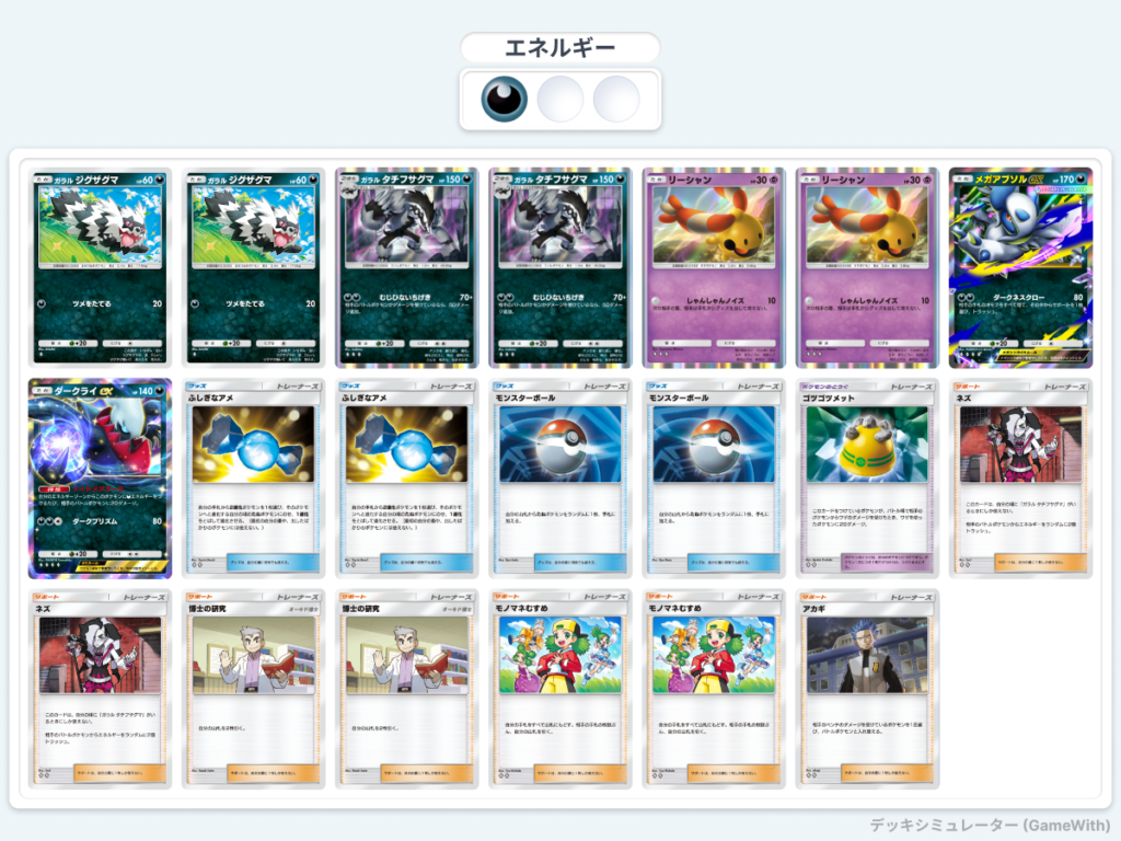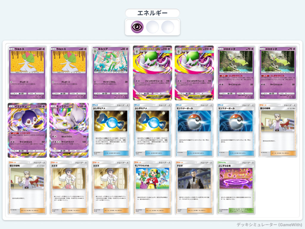 - メガサーナイトexのエネルギー加速を活かし、ミュウツーexへ効率よくエネルギーを供給できるデッキです。