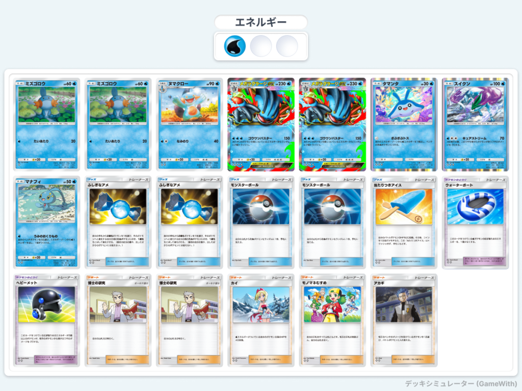 - メガラグラージexで150ダメージを狙いつつ、相手のエネルギートラッシュにも期待できる点も魅力のデッキです。