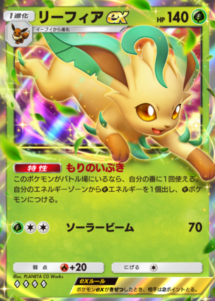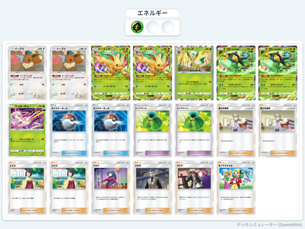 - リーフィアexのエネルギー加速によって、オーガポンexや非exリーフィアのワザダメージアップを狙えます。序盤からリーフィアexをバトル場に出し、安定したエネルギー供給を行うことが理想です。