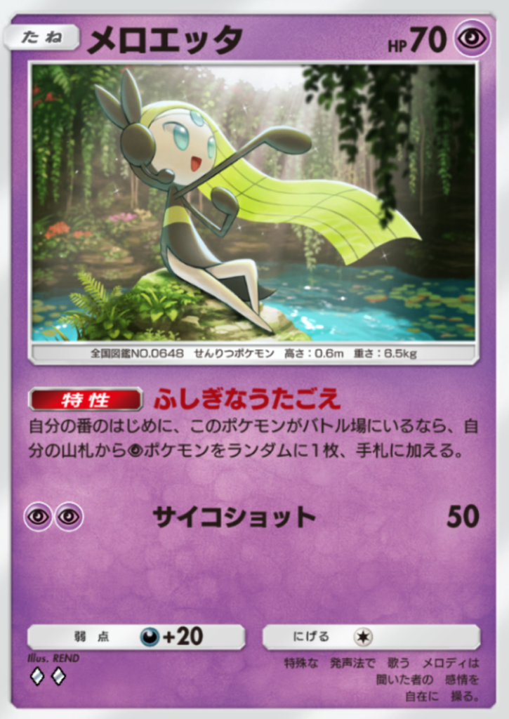 - メロエッタは特性で超ポケモンをサーチできるため、できるだけバトル序盤に場へ出しておきたいカードです。