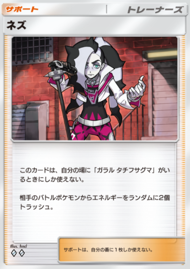 - ガラル タチフサグマが場にいる状態でネズを使うことで、相手バトルポケモンのエネルギーを2個トラッシュし、相手の動きを大きく制限できます。