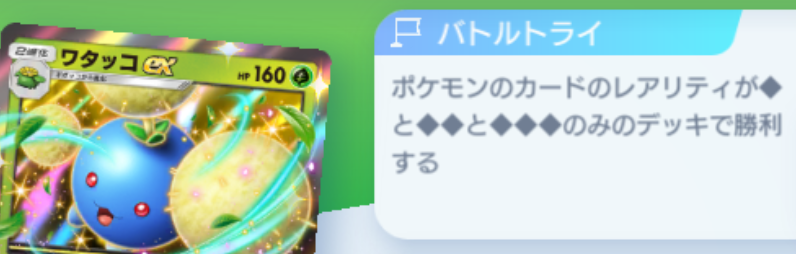 バトルトライ「ポケモンのカードのレアリティが♦︎と♦︎♦︎と♦︎♦︎♦︎のみのデッキで勝利する」もクリアできるデッキです。