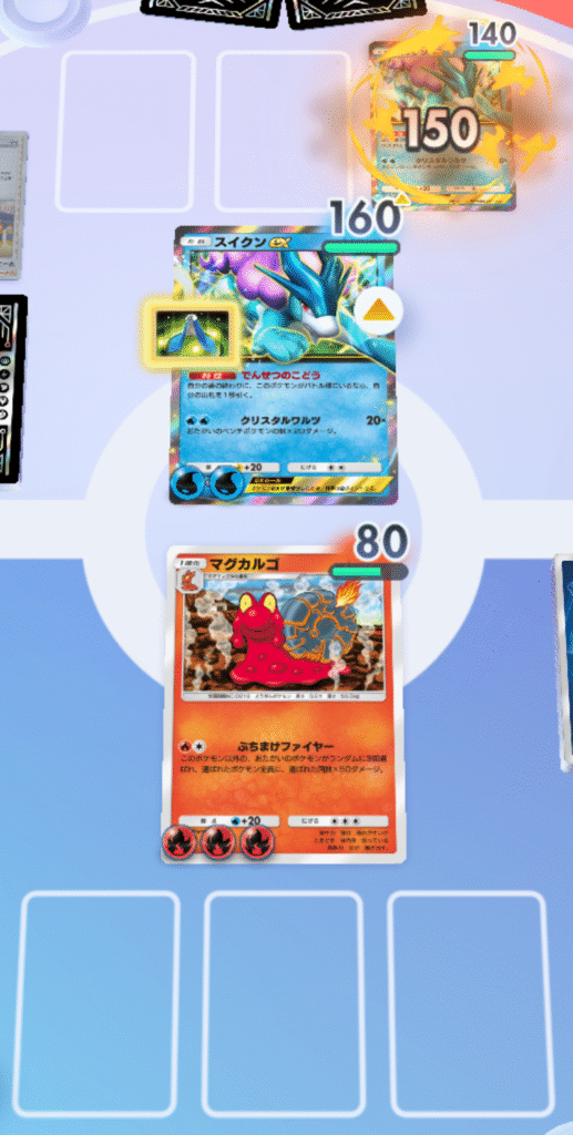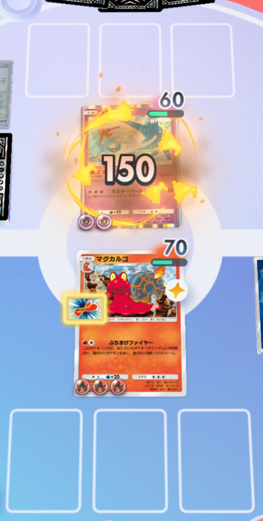 - マグカルゴはエネルギー2個で最大150ダメージを与えられます。自分のベンチポケモンにも被ダメージの可能性がありますが、マグカルゴ単デッキならそのリスクも抑えられます。
