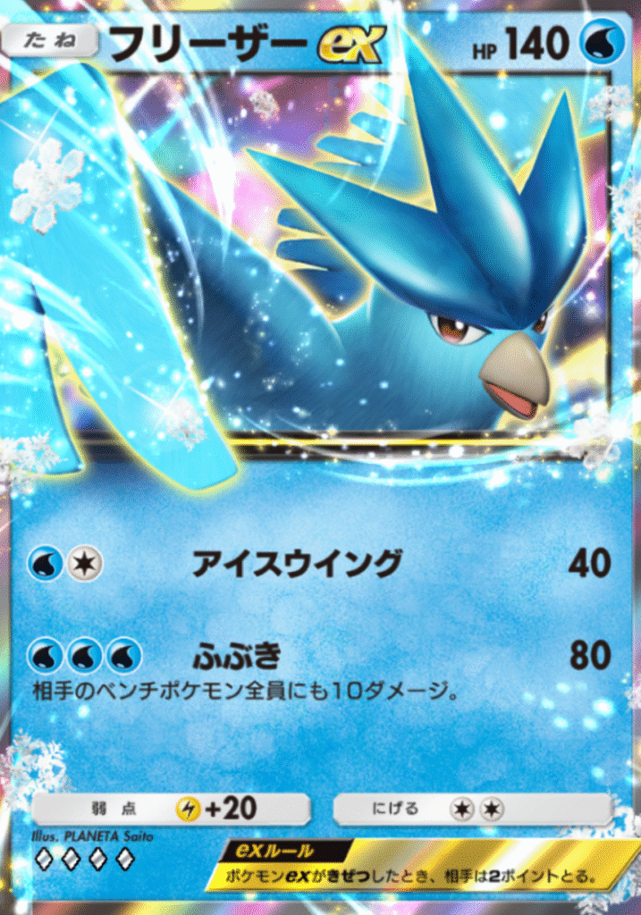 - フリーザーexは水エネルギー3個で相手バトルポケモンに80ダメージを与え、さらに相手のベンチにもダメージを与えられます。