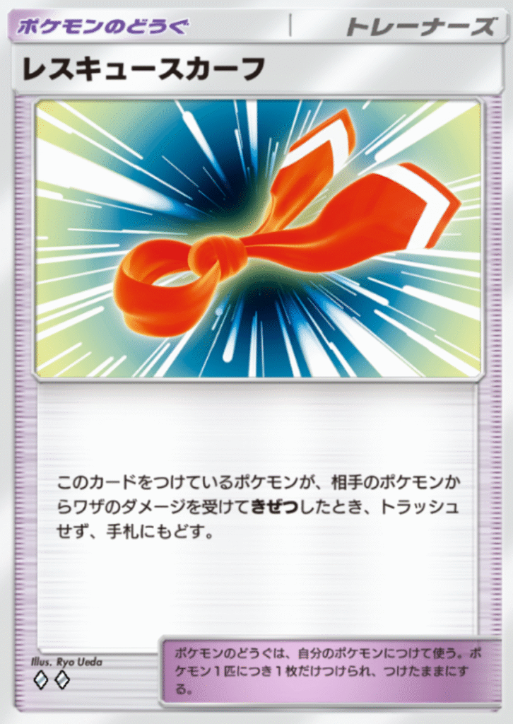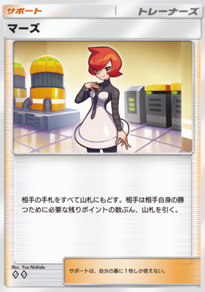- 豊富なトレナーズカードを活用し、回復(きずぐすり/おおきいマラサダ/大きなマント/ポケモンセンターのお姉さん)、ワザダメージの増加(サカキ・レッド)、手札の充実(博士の研究/モンスターボール)、相手の妨害(グズマ)を狙えます。