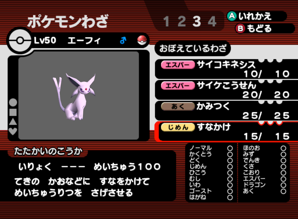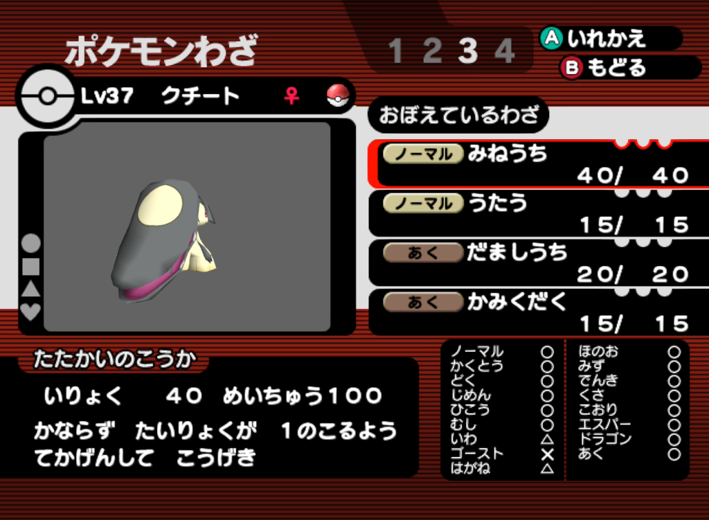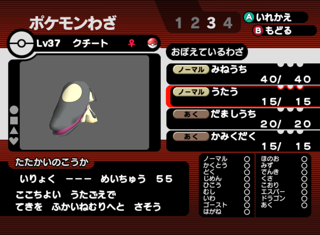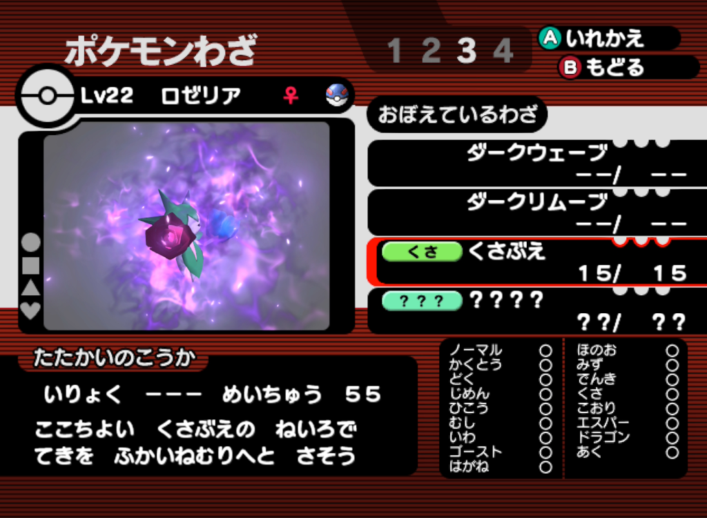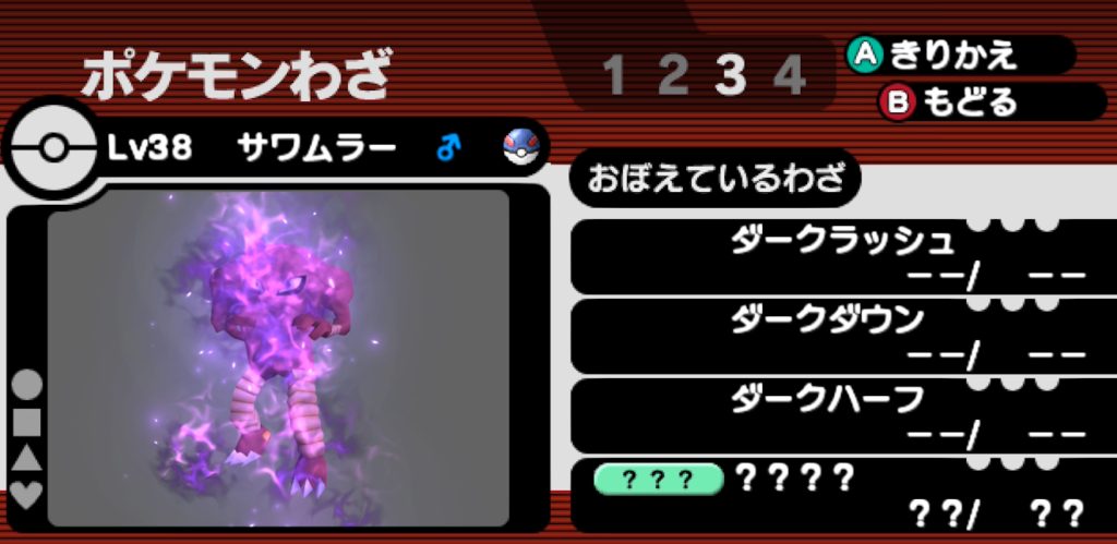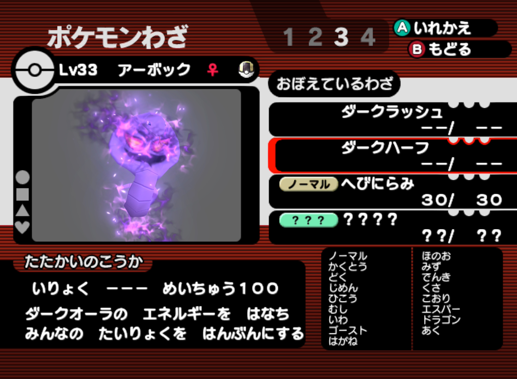• ダークハーフ:場にいる全ポケモンの残りHPを半分にする。ただし、使用した次のターンは行動不能になる点に注意