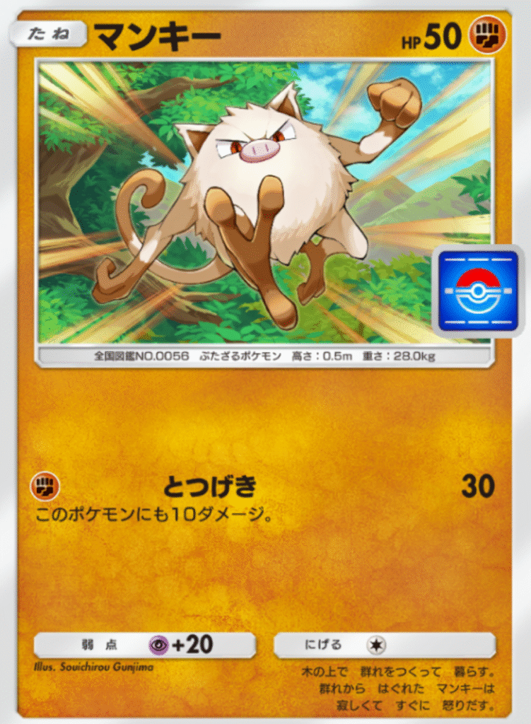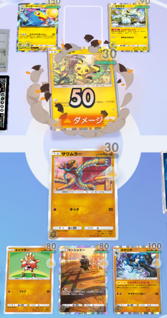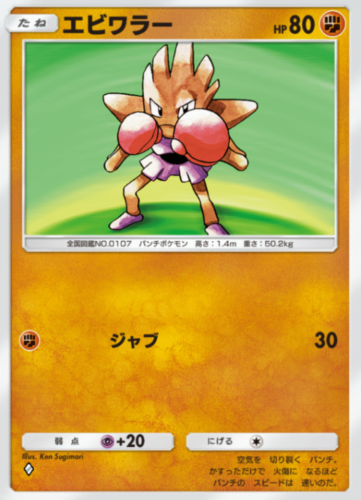 - エネルギー1個で30ダメージを与えられるエビワラー(最強の遺伝子リザードン)、サワムラー(シャイニングハイ)、マンキー(プロモ)を採用し、相手のブビィやピチューを素早く倒す戦術です。