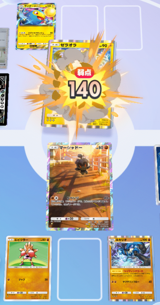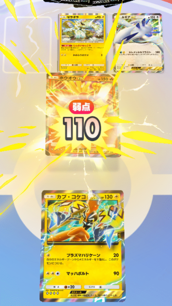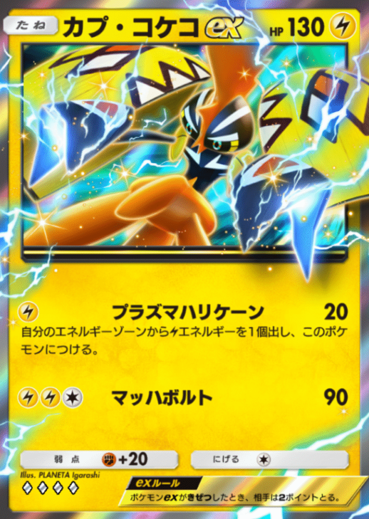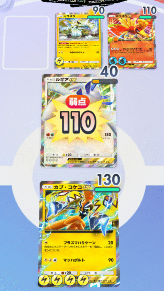 カプ・コケコexの「マッハボルト」で相手のゼラオラを一撃で倒せます。ホウオウexやルギアexにも弱点をつけます。