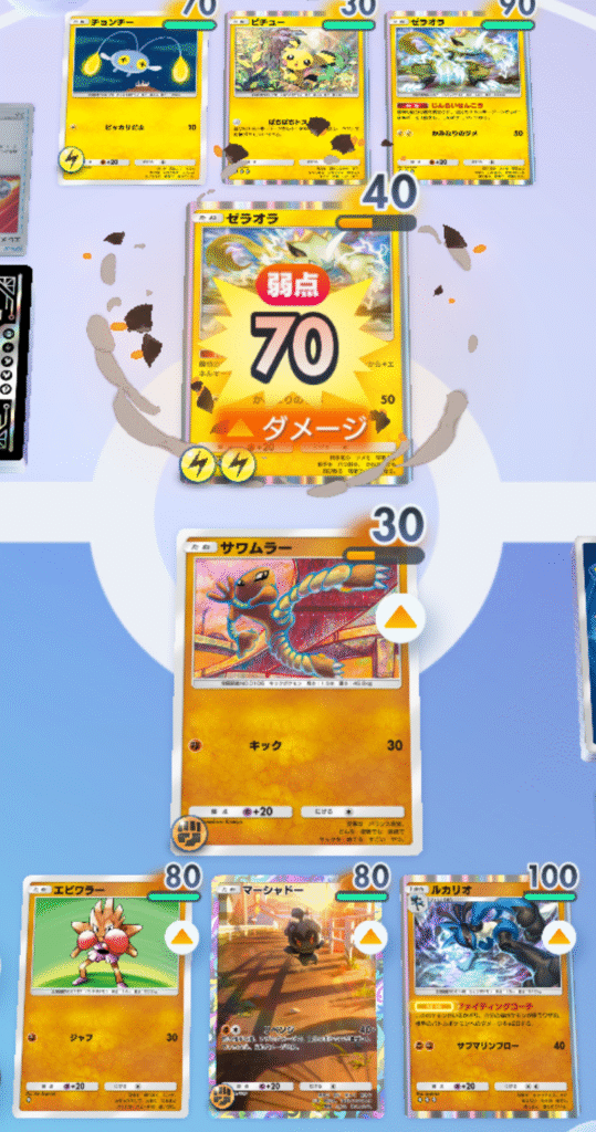 ルカリオの特性でワザダメージを強化したサワムラーとマーシャドーで、相手ポケモンを次々と倒して勝利しました👇
