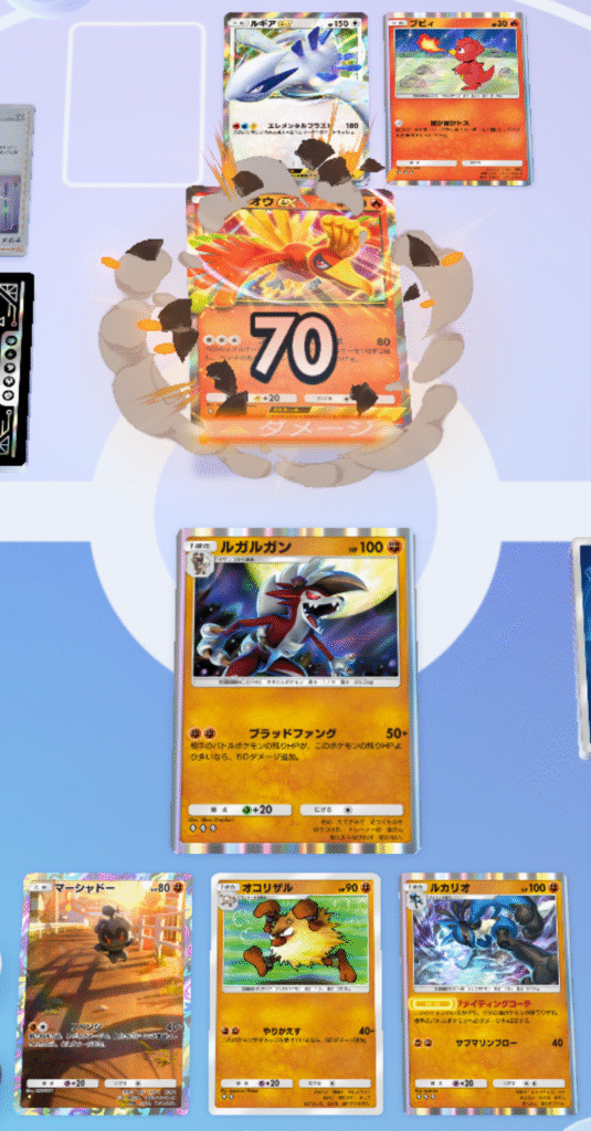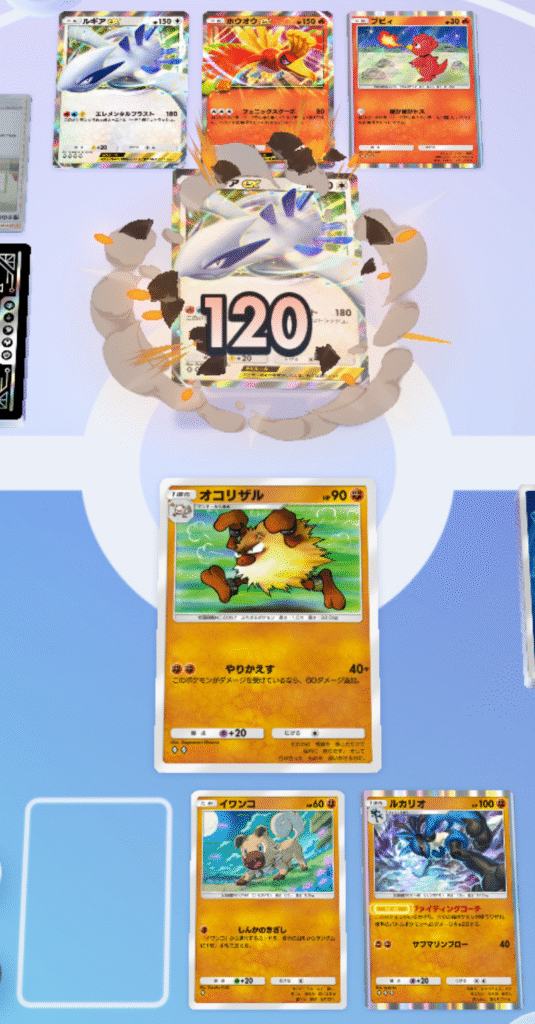 ルカリオの特性でワザダメージを強化したオコリザルとルガルガンで、ルギアexとホウオウexを撃破して勝利しました👇
