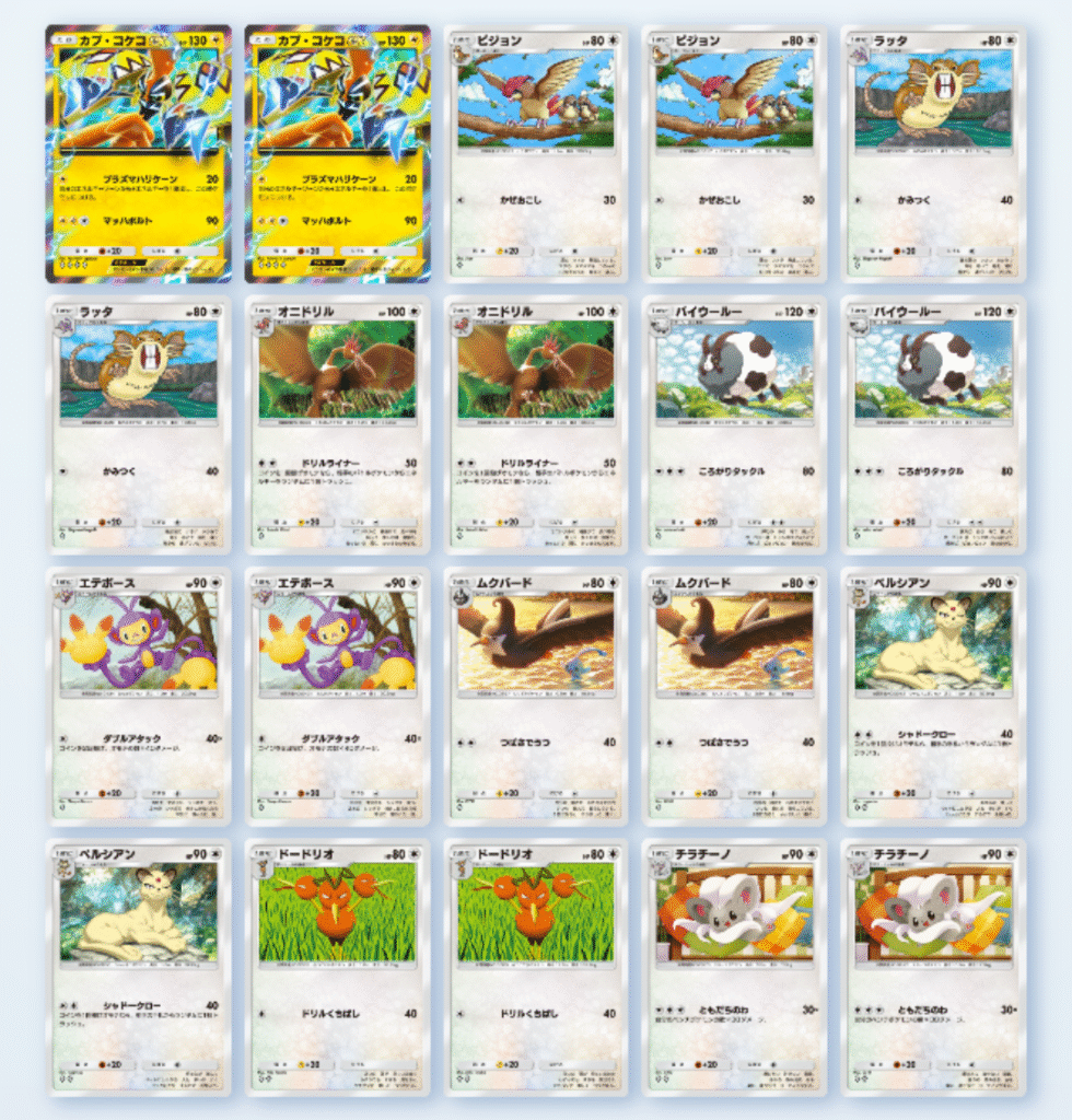 - カプ・コケコex以外のたねポケモンをバトル開始時の手札に引かないように、他のカードは1進化の無色ポケモンを採用しています。