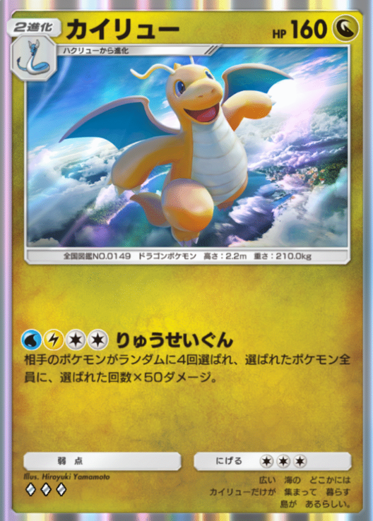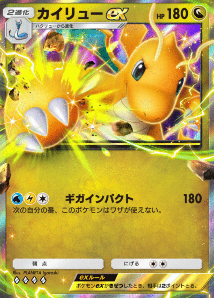 例えば、水と雷のエネルギーを必要とするカイリューやカイリューexをホウオウexでサポートするには、まずミニリュウにエネルギーを付ける必要があります。