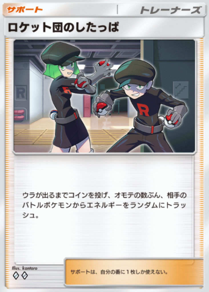 サポートカードは1ターンに1枚しか使えません。イツキ自身がサポートカードであるため、カスミやロケット団のしたっぱといった強力なサポートカードのコイントスを確実に表にすることはできない点に注意が必要です。
