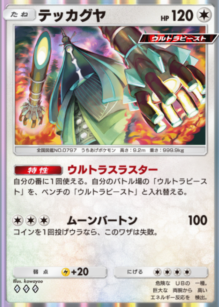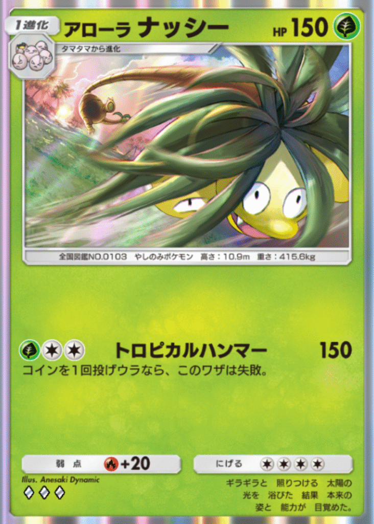 アローラ ナッシーは、エネルギー3個でコインが表なら150ダメージを与えるワザを持ちます。イツキを使えば、非exポケモンで確定150ダメージを狙えるのは非常に強力です。