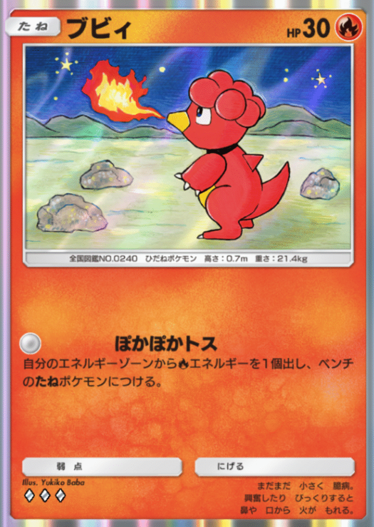 ブビィやピチューといったベイビィポケモンは、ワザに必要なエネルギーが不要で、先攻1ターン目からベンチポケモンに炎エネルギーや雷エネルギーを付けることができます。