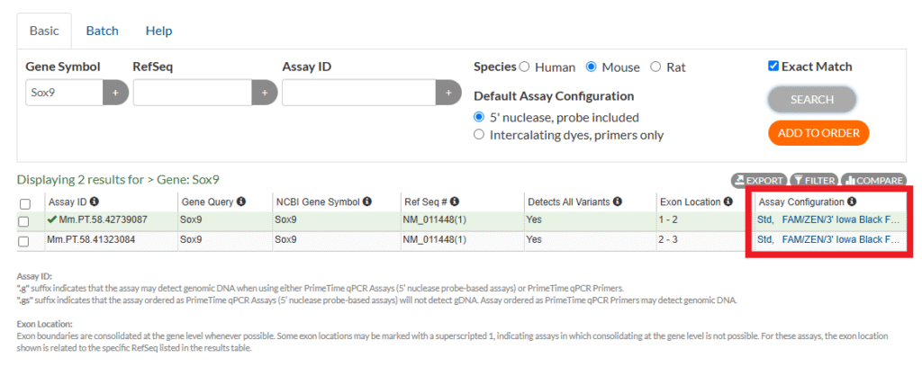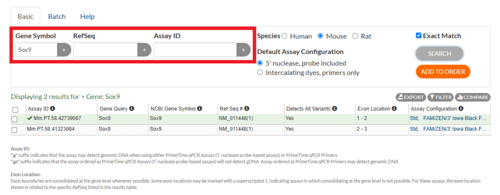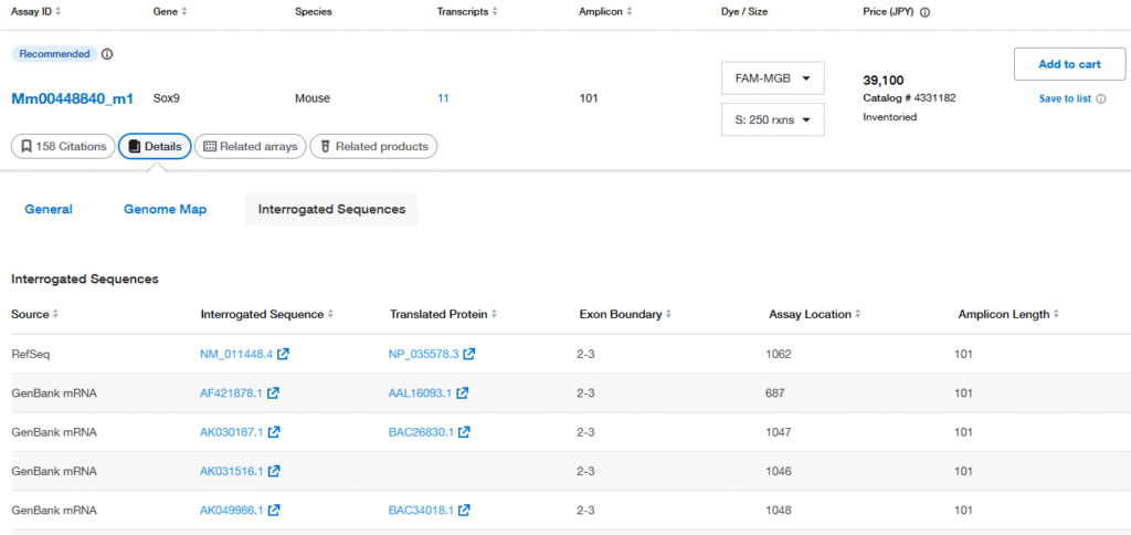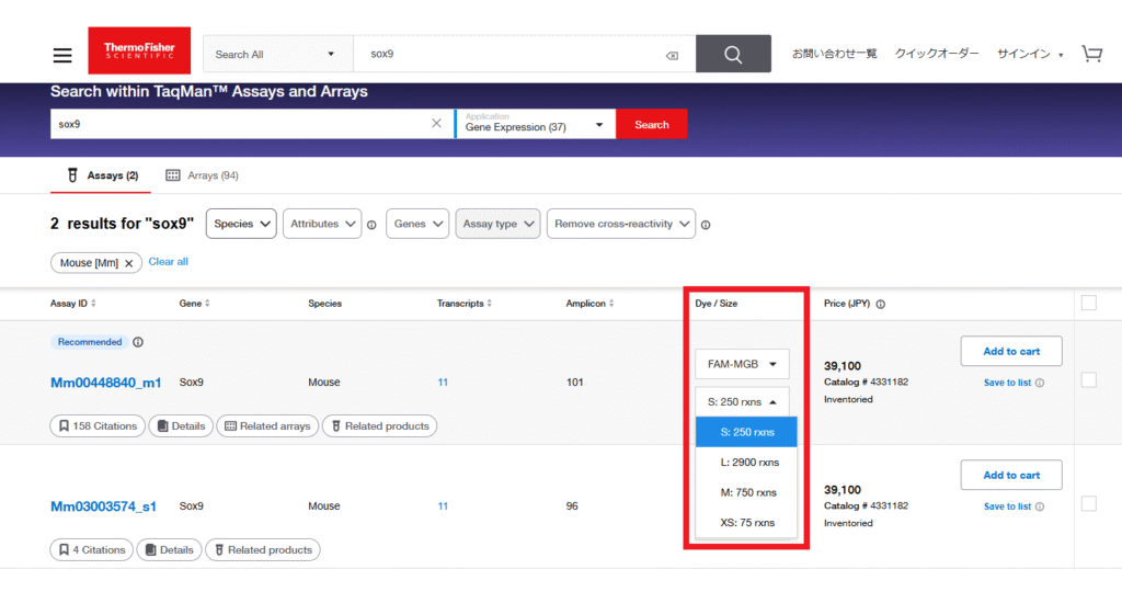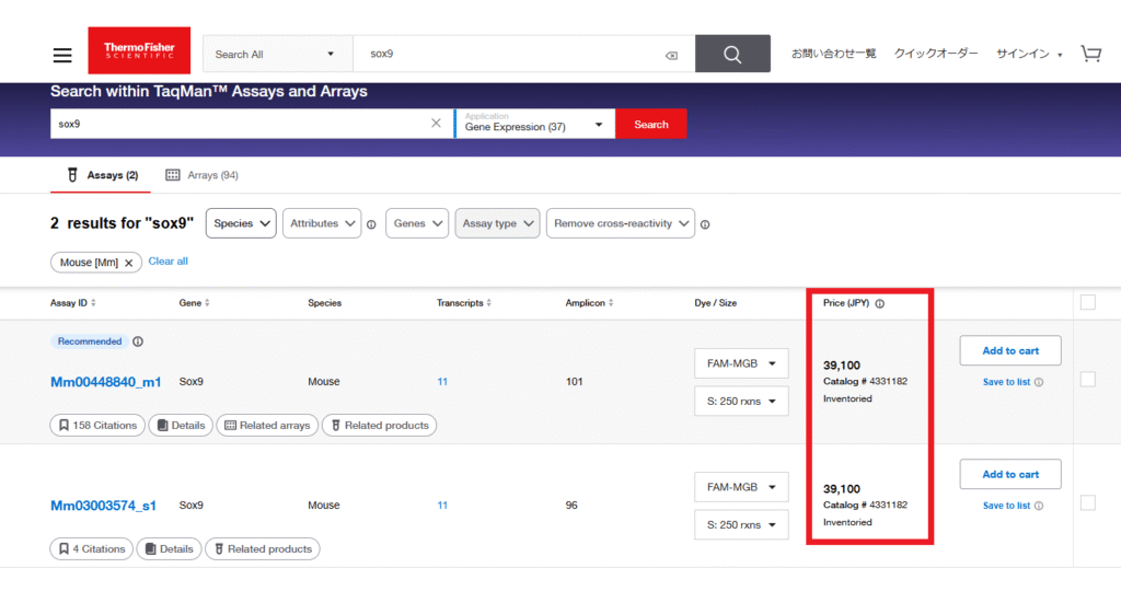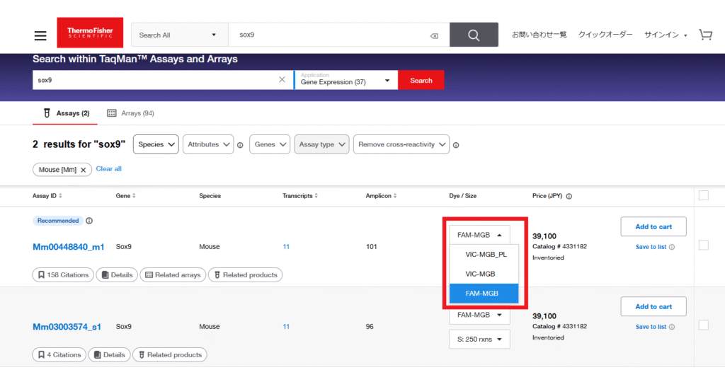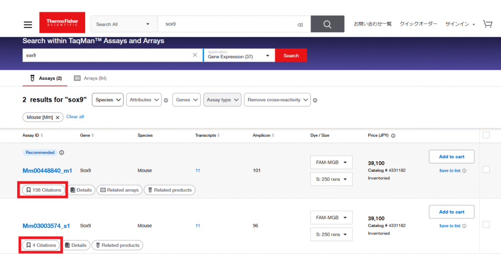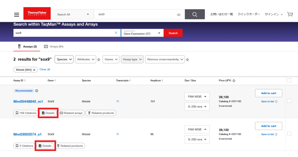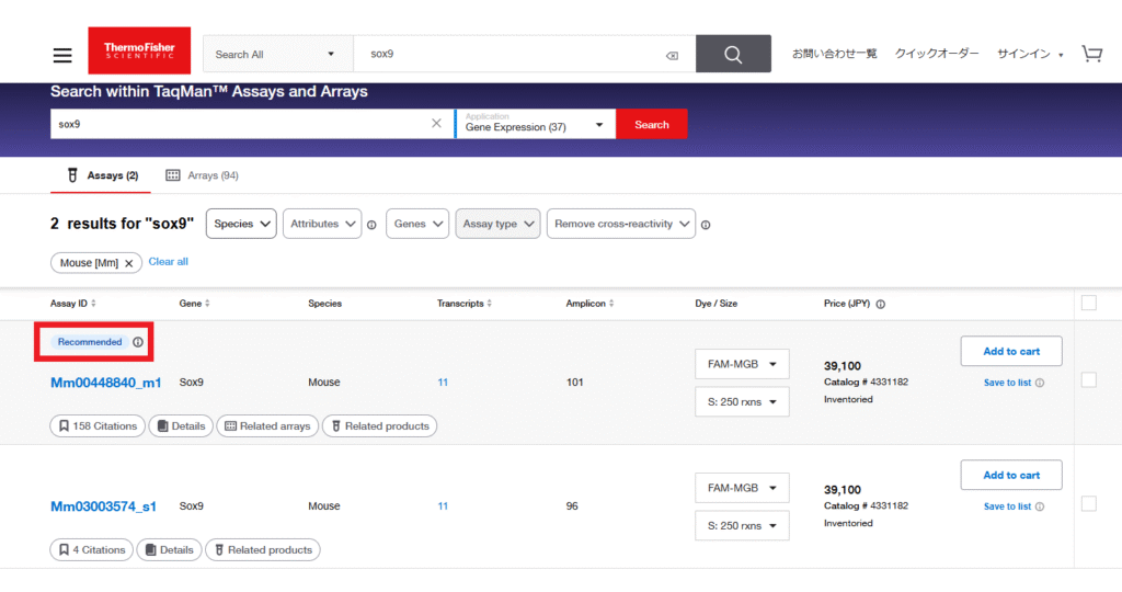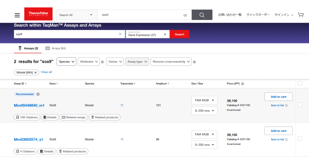 特定のAssay ID(例:Sox9の場合は Mm00448840_m1)のプローブミックスを検索する場合は、そのIDを直接検索することも可能です。