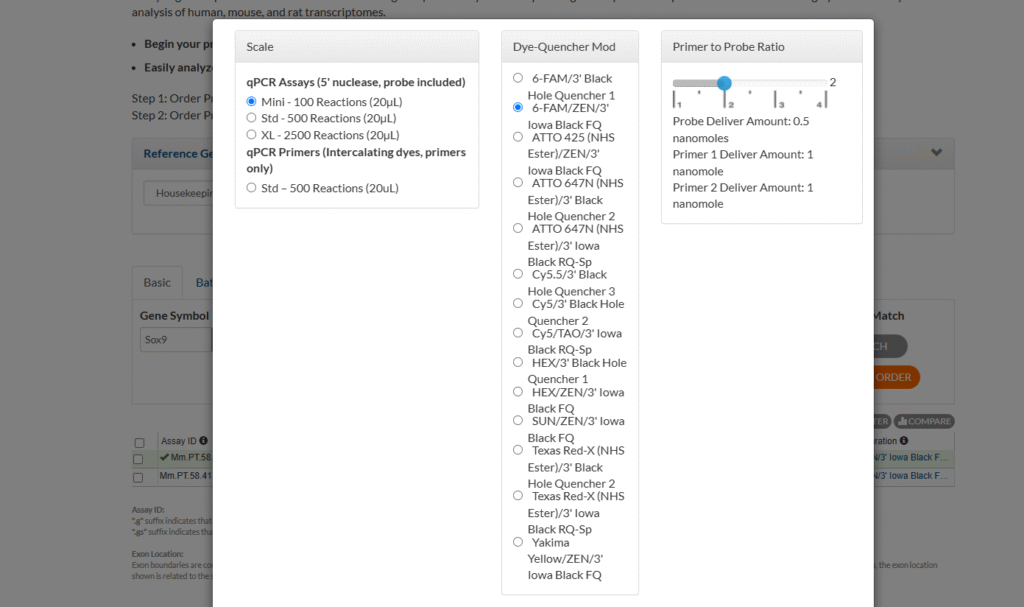 検索結果の「Assay Configuration」をクリックすることで、プローブミックスの容量や蛍光色素の種類を選択できます。